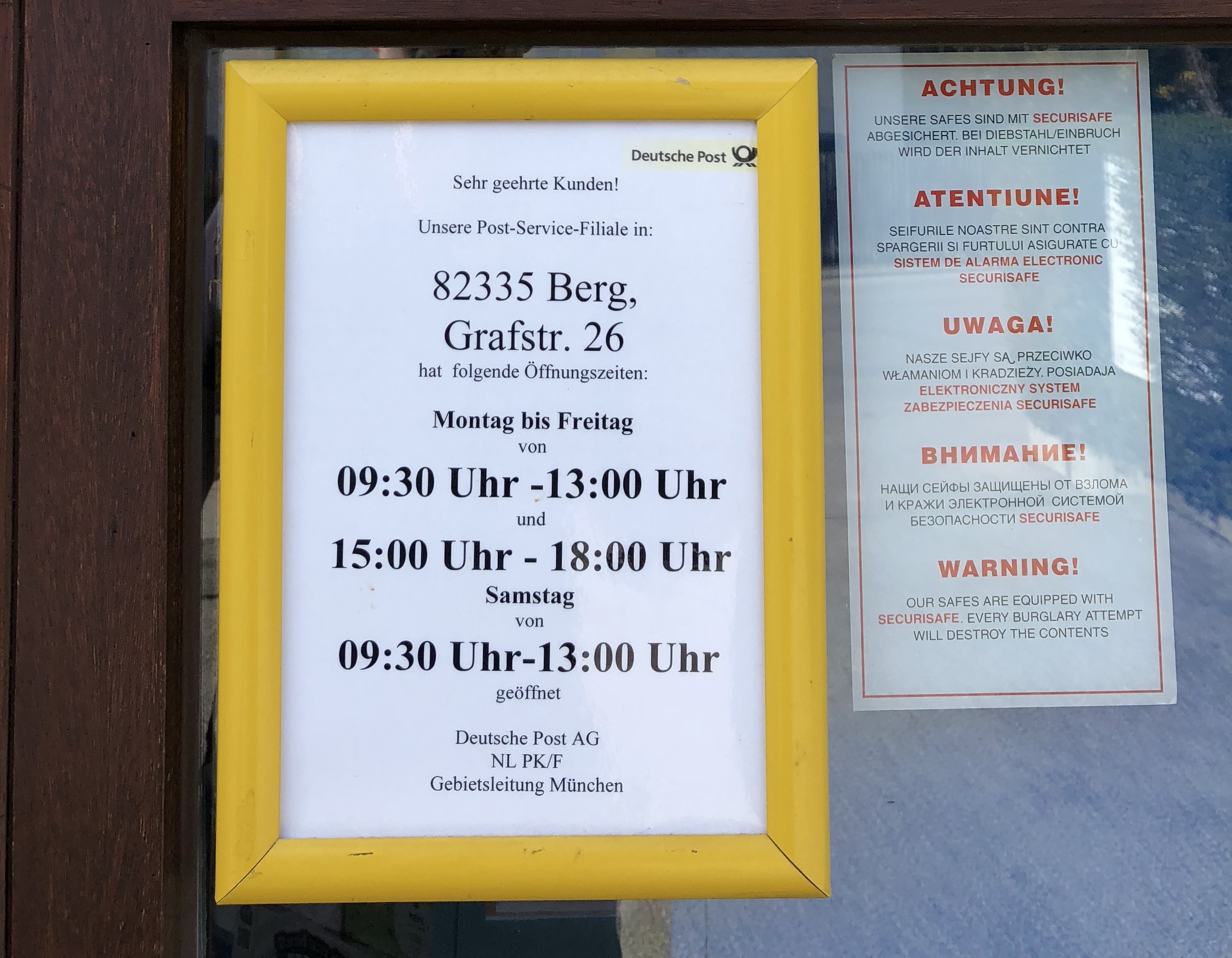 Inhalt des Briefes war die Ankündigung, dass ihr Postfach umziehen wird. Am 31.05. schließt der Postfachstandort in der Postfiliale im Buchladen ‘Schöner Lesen’ und zieht in die Schatzlgasse 4.