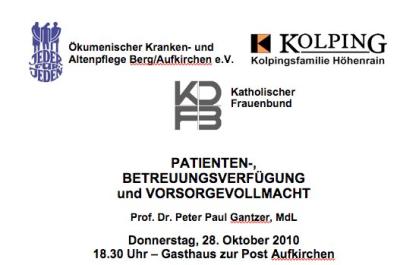 Gemeinschaftlich laden der Ökumenische Kranken- und Altenpflege e.V., der Katholische Frauenbund Aufkirchen sowie die Kolpingsfamilie Höhenrain zu einem Vortrag des Rechtsanwalts, Notars und MdL Prof. Dr. Peter Paul Gantzer (der auch in diesem Blog als wehrhafter Kämpfer für die Vernunft bereits Erwähnung fand / /?p=3325/) ein. Er spricht über folgende Fragen: