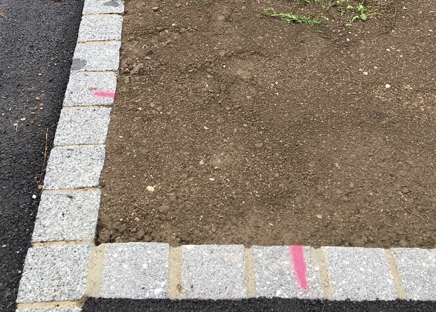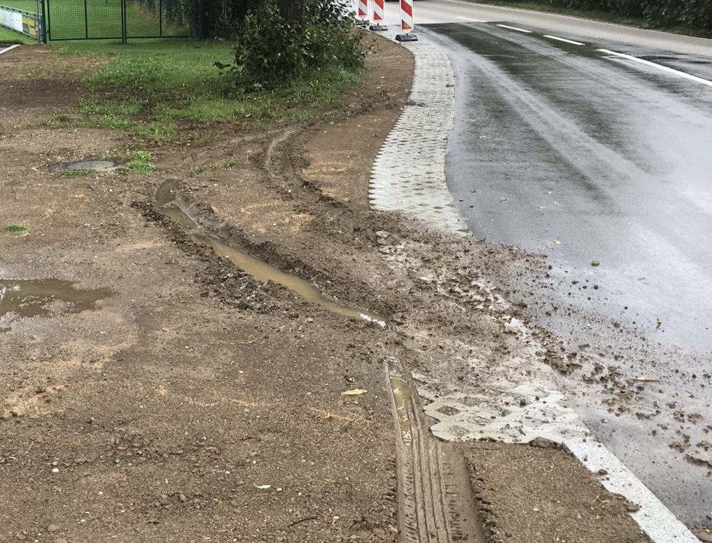 Quasi über die Bande ist hier jemand querfeldein durch den frisch angesäten Rasen gefahren, wohl um zu wenden. Wenigstens konnte er oder sie noch nicht gegen den Laternenmast döngeln …