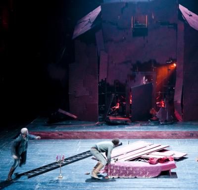 Auch die Bühne ein Hauptdarsteller: Käthchen (Lucy Wirth) stürzt sich in das brennende Schloss, das gleich mit großem Knall einstürzen wird (links unten flüchtet unser Marcus; Fotos: Thomas Dashuber)