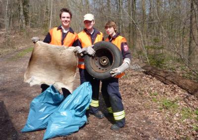 Freuen sich über einen Autoreifen und ein Ziegenfell: Jungfeuerwehrler Markus, Jasper und Michi