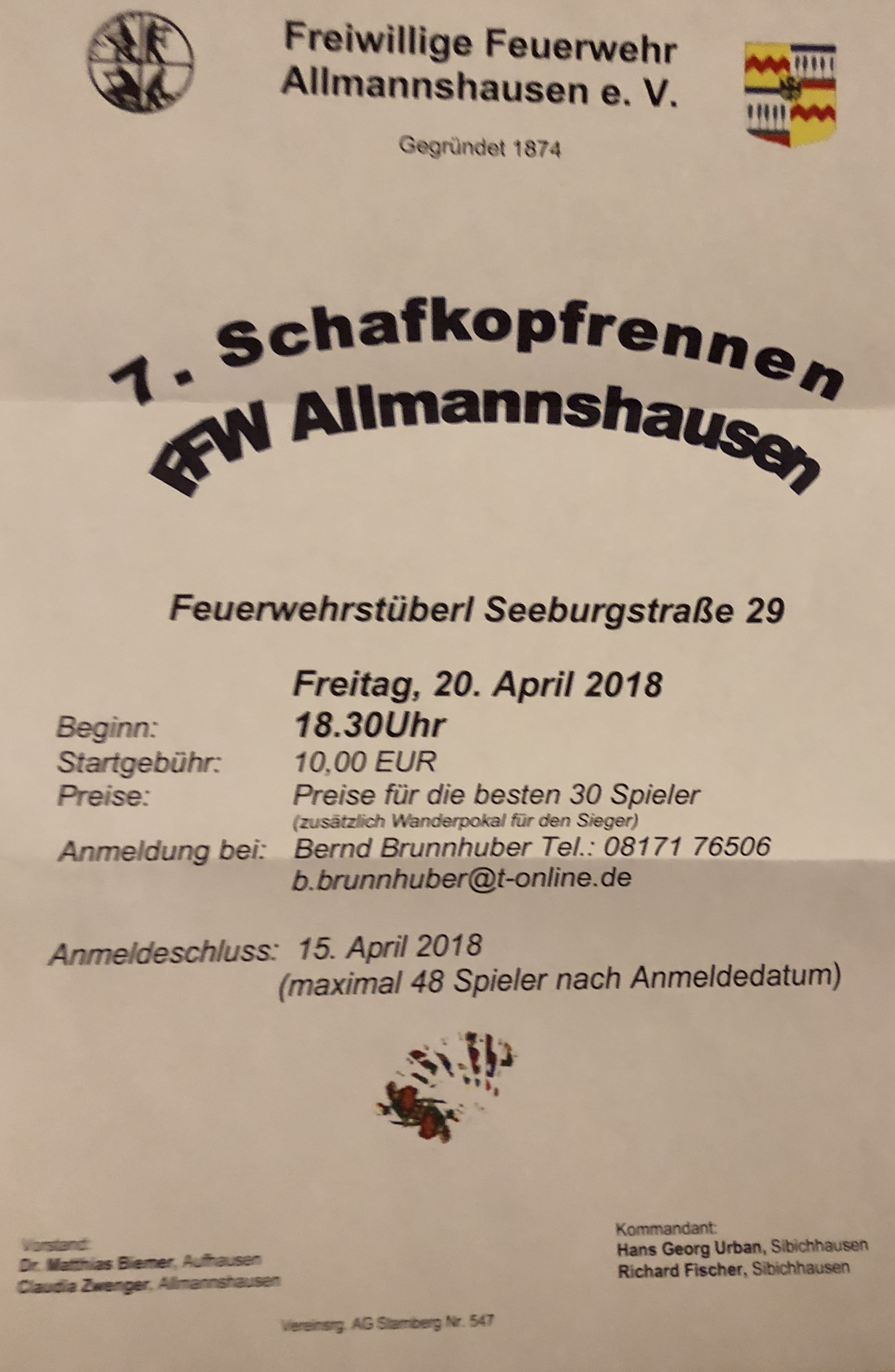 Zum siebten Mal bereits lädt die Freiwillige Feuerwehr Allmannshausen e.V. zum Schafkopfrennen – am 20. April.