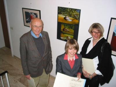 Alle versammelten sich im ersten Stock neben dem Zimmer des Bürgermeisters vor den Preisträgerbildern, und Gerd Jäger, der 1. Vorsitzende der Ortsgruppe Berg, überreichte die Urkunden an Jürgen Lehmann (1.), Christiane Hoffelner (2.) und Isabel Kalinke (3.).