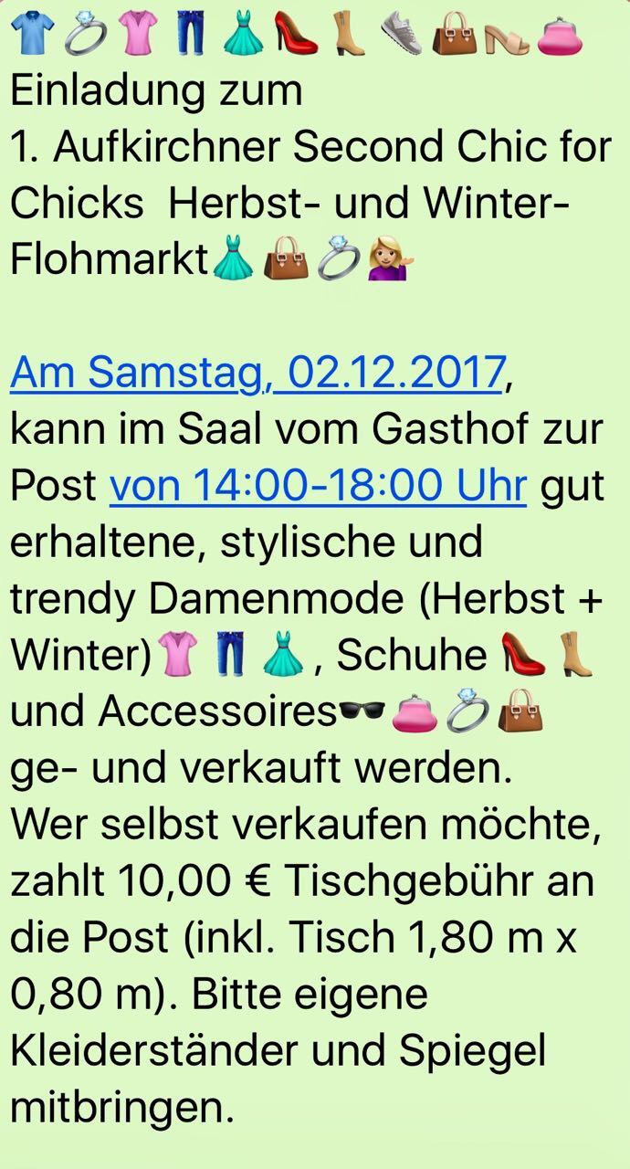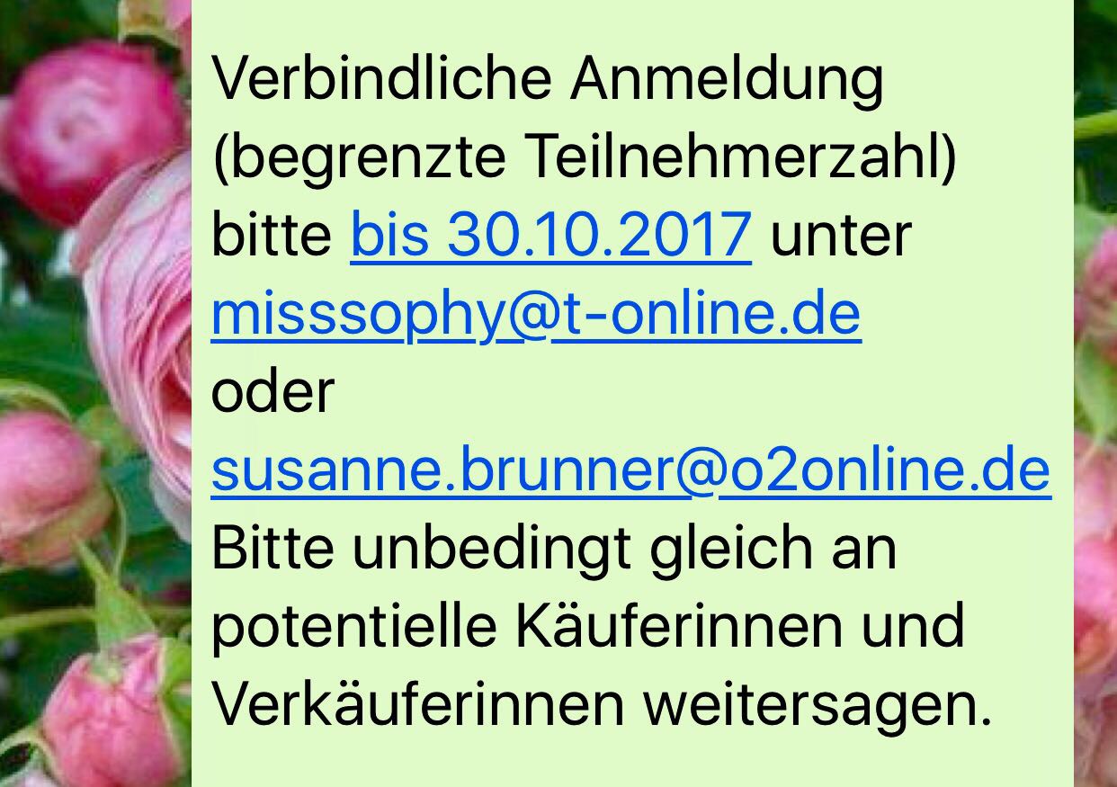 Es steht schon alles im Text – bitte per Mail bis zum 30.10. bei misssophy@t-online.de oder Susanne.brunner@o2online.de anmelden. Mit 10 € sind Sie im Gasthof Die Post dabei und bekommen sogar einen Tisch dafür.