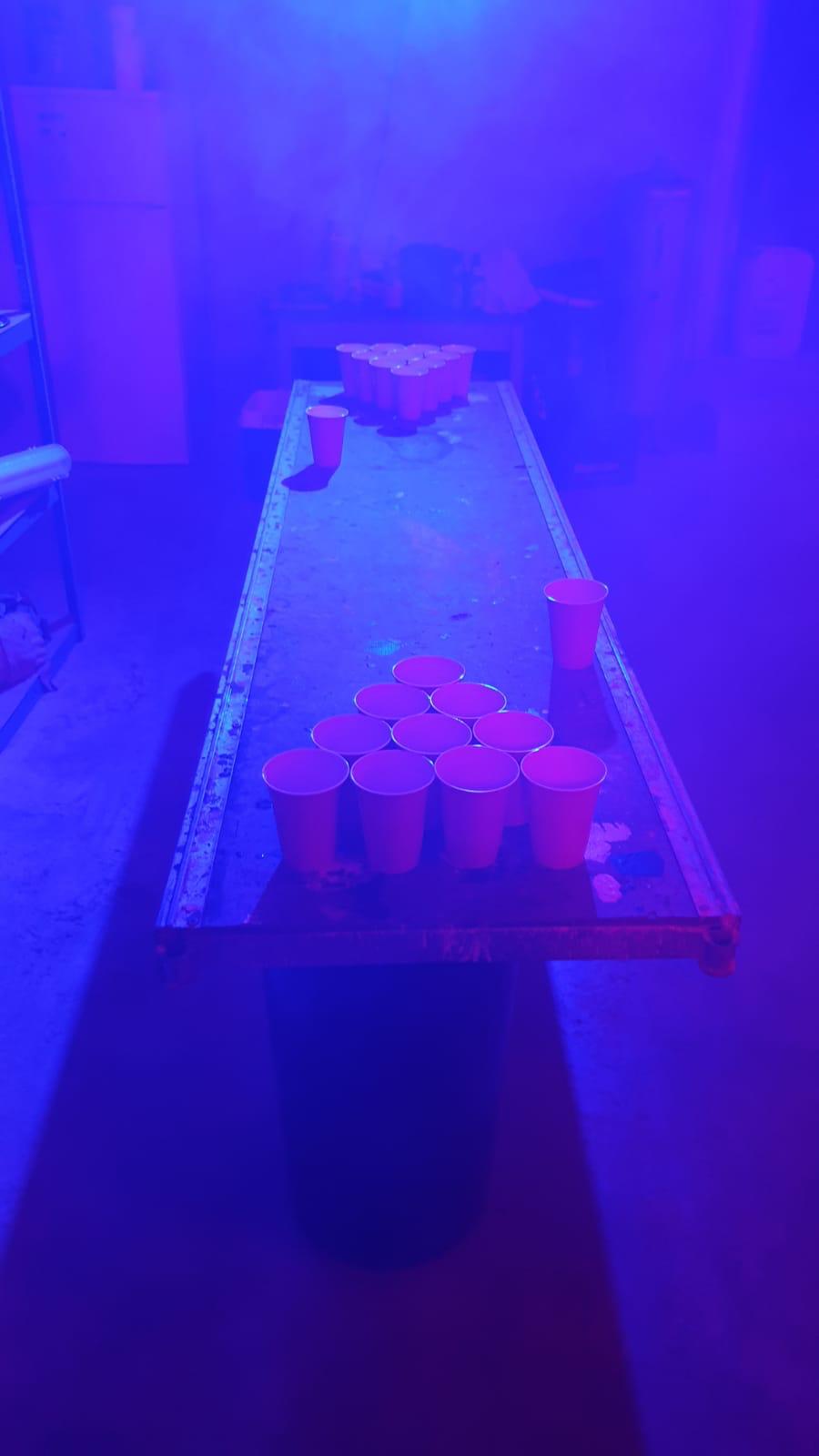 Alles versammelt: das Logo, die Tische, die Becher, die Spieler