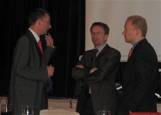 Frisch versöhnt: Postwirt Andi G. an Rathauschef Rupert M. / sowie Festredner Stefan M. mit Geisterfeder Andy A.