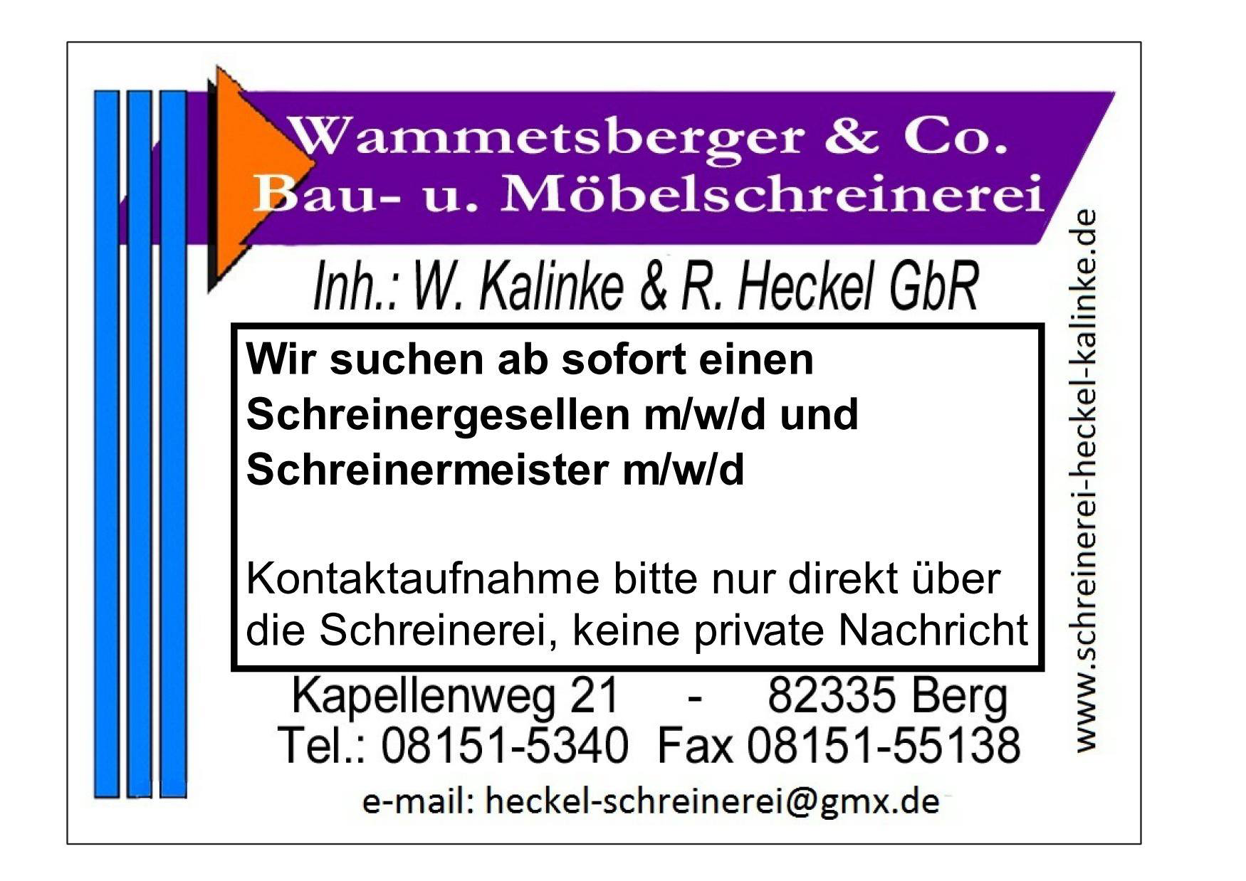Schreinergesellen und -meister (m/w/d) gesucht! Die Schreinerei Wammetsberger & Co (Inhaber ist die GbR von Winfried Kalinke und Rainer Heckel) im Kapellenweg sucht dringend zwei qualifizierte Menschen, die bei ihr arbeiten möchten. Die Schreinerei liegt mitten im Ortsteil Berg am Kapellenweg.