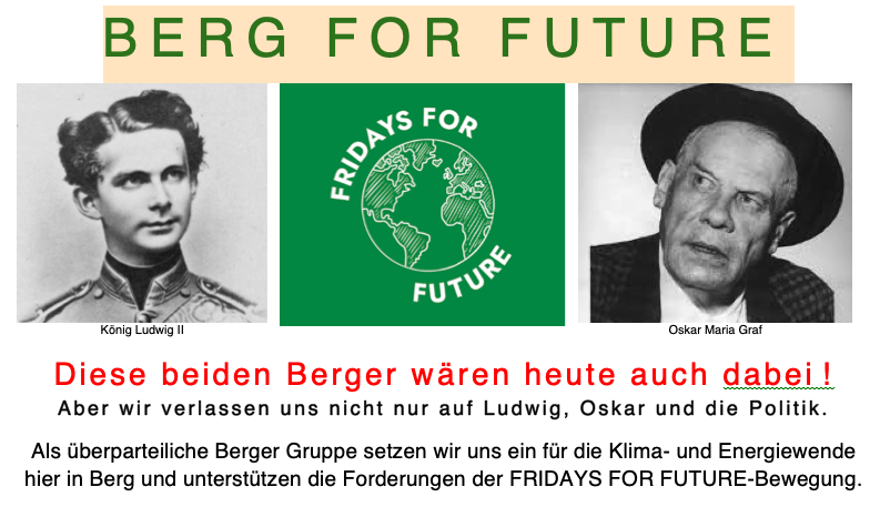 Im Landkreis gibt es nur in Tutzing eine Protestaktion (um 10 Uhr auf den Lindlwiese), die von der STAgenda veranstaltet wird. Zur zentralen Kundgebung in München auf dem Königsplatz um 12 Uhr werden fünftstellige Protestbesucherzahlen erwartet. In Berg hat die Initiative “Berg for Future” zum “Gespräch mit Oskar Maria Graf” geladen und schenkt dazu um 16 Uhr am OMG-Denkmal in Aufkirchen Freibier und Berger Apfelsaft aus, um für “strikte Gesetze zur CO2-Reduzierung” und “Konsequenten Klimaschutz in der Kommune” aufzurufen.