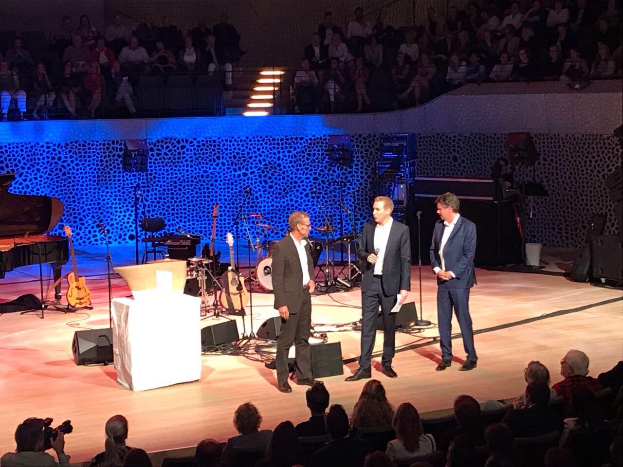 Das Schiff, der Künstler, der Moderator, der Auktionator (Hans Panschar, links und der Chefredakteur des Hamburger Abendblatts, Lars Haider, rechts)