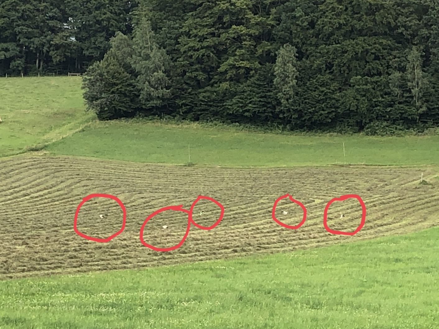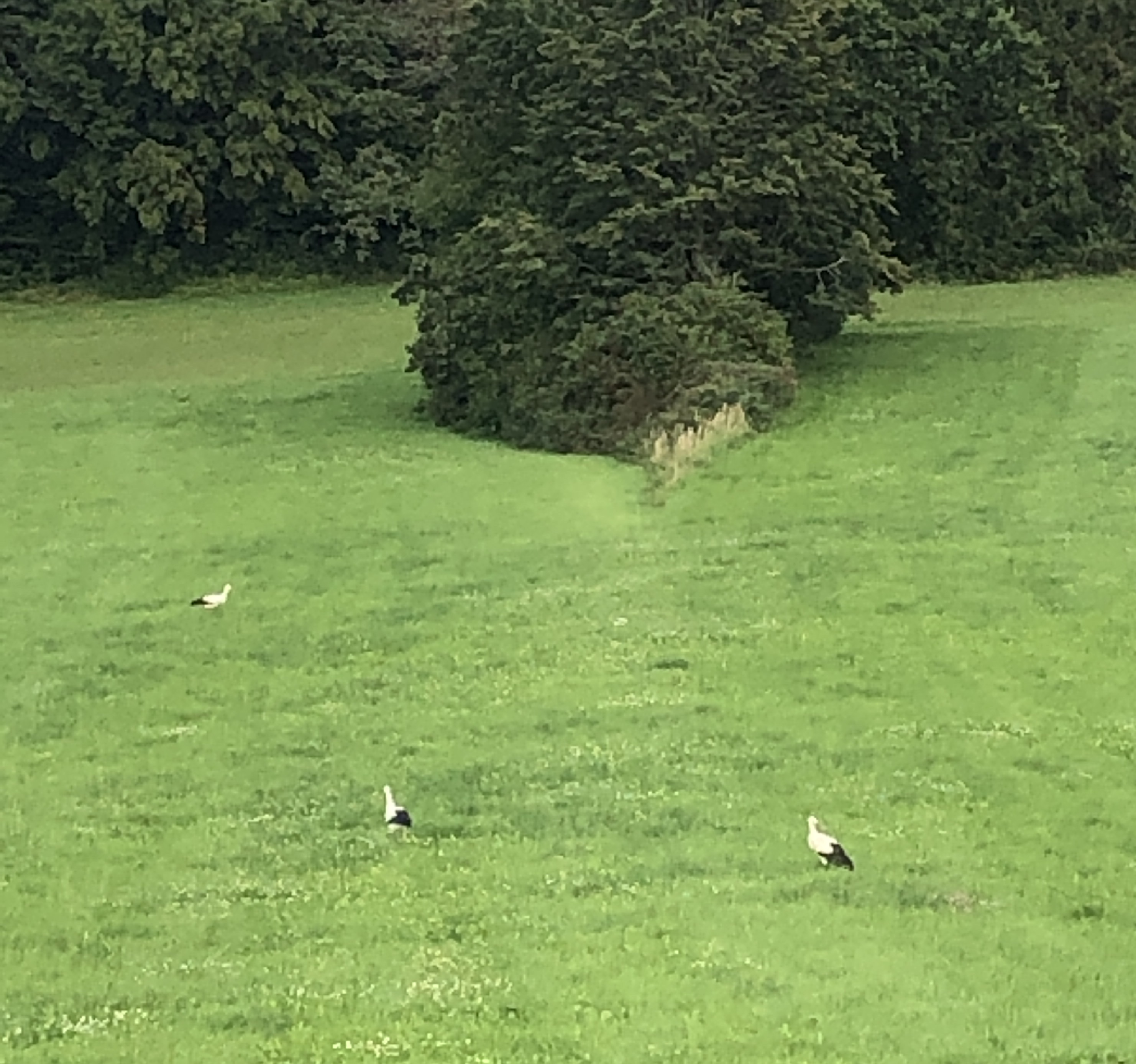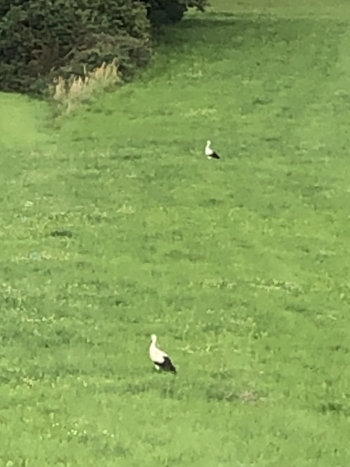 Bei den am Kreuzmöslberg zwischengelandeten Exemplaren handelt es sich offenbar um Weißstörche. Auf den Fotos sind sie leider schwer zu erkennen, daher haben wir sie umkringelt.