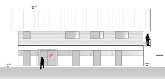 Am durchdachtesten erscheint vom Raumprogamm her der Entwurf von Volker Cornelius. Er hat einen Kiosk für das Publikum berücksichtigt, die Umkleiden wären für die Turner und die Fußballer nutzbar, der Turnsaal mit Küche und Durchreiche auch als Veranstaltungsraum gedacht und eine irgendwann nötige Erweiterung ist bereits mit entworfen. Der Entwurf war zudem am günstigsten (625.000€); allerdings stellte sich heraus, dass darin u.a. das Honorar noch nicht einkalkuliert ist.