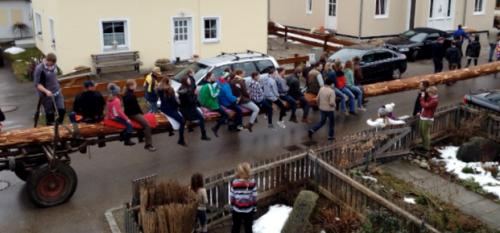 Und auch am Kirchplatz ging es vorbei, denn dort durfte der Baum aus Lärmschutzgründen diesmal nicht gelagert werden. Bei der Vorbeifahrt durfte der alte Maibaum, der in Farchach sogar noch steht, schon einmal seinen Nachfolger bewundern.