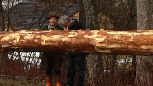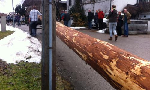 Von 42 auf immer noch stolze 35 Meter wurde das erst letztes Wochenende geschlagene und frisch geschebste Fruchtbarkeitssymbol gestutzt. “Aber so bleibt er jetzt auch”, sagen 1. Oberbursch Sepperl Darchinger und 2. Oberbursch Matthias Stock.
