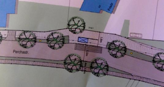 Eine der schönen Ideen von Ott/Puttkamer/Terrabiota: Entschleunigung des Verkehrs durch Anlegen einer kleinen Engstelle mit Bäumen an der Bushaltestelle. Vom Gemeinderat samt Bürgermeister abgelehnt mit 11:9