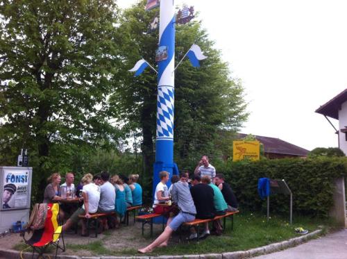 Was ist denn da los? Wer sitzt da kurz vor dem Unwetter unter dem Maibaum und trinkt in aller Ruhe ein Bier? Eine Gruppe von Vätern? Weit gefehlt – es ist die Berger Burschenschaft, die jede Gelegenheit zum Feiern beim Schopf packt und heute mal die Tatsache feiert, dass sie noch nicht Väter sind …