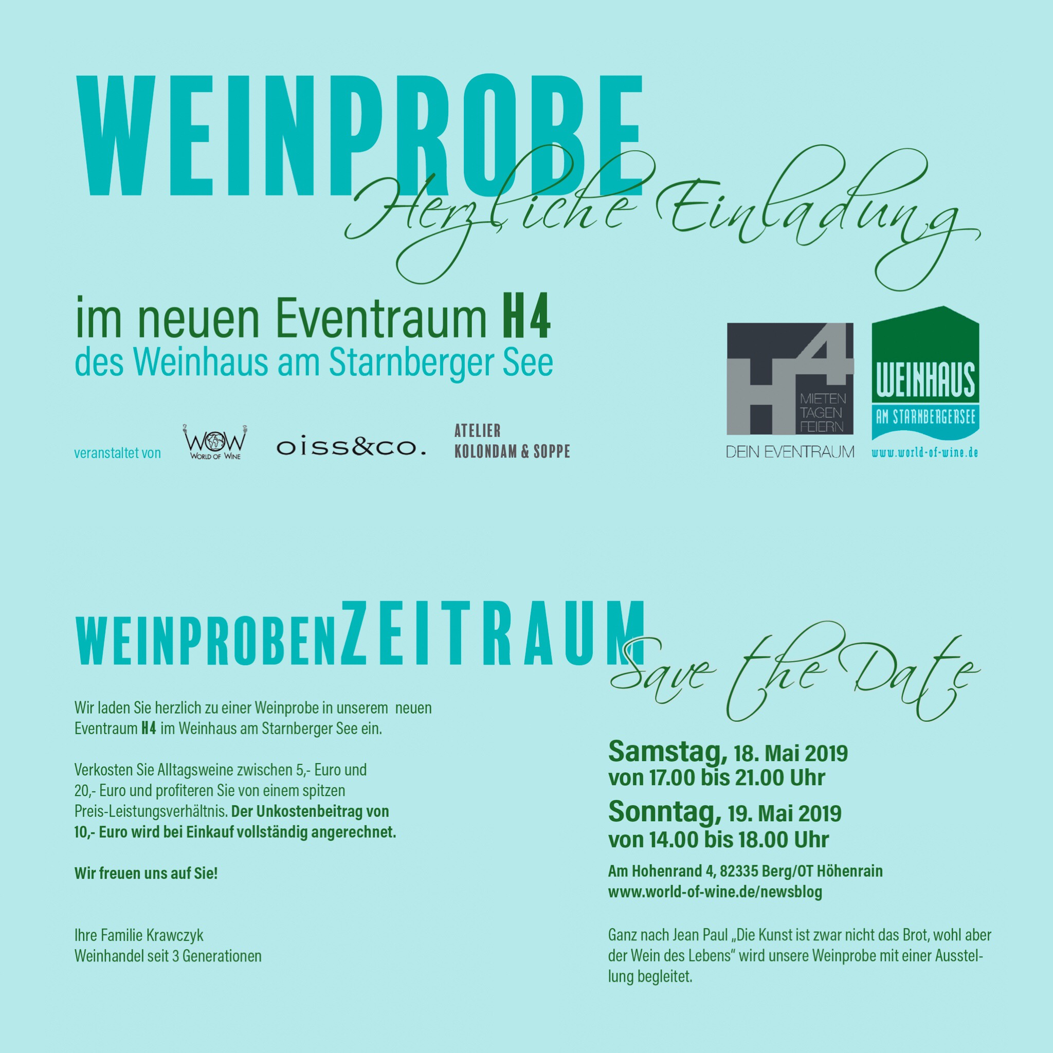 Wie angekündigt gibt es an diesem Wochenende eine Weinprobe der besonderen Art. Heinz Krawczyk, Inhaber von World of Wine, weiht seinen neuen Eventraum “H4” ein – gemeinsam mit seiner Schwester, die in Percha den Laden “oiss&co” betreibt, sowie dem Atelier Kolondam &Soppe, das sich im ersten Stock befindet.