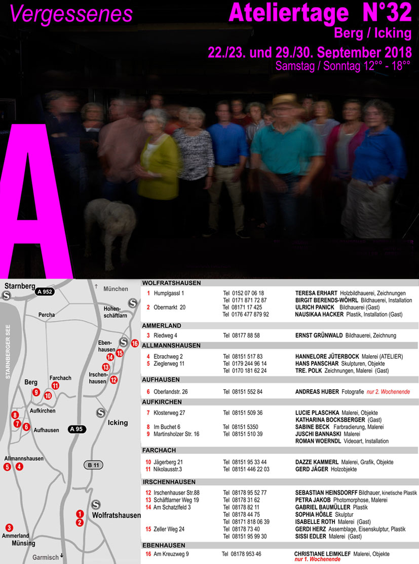 Zum 32. Mal jähren sich die Ateliertage Berg/Icking. Diesmal präsentieren die Künstlerinnen und Künstler sowie ihre Gäste Werke zum Thema “Vergessenes”.