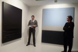 Im Uhrzeigersinn: Karsten Löckemann von der Münchner Sammlung Goetz hält die Eröffnungsrede, der Ulmer Künstler Michael Gerngroß vor einem Werk, selbiger mit der immer charmanten Galeristin, Detail einer “Horizontalen Struktur” (so auch der Titel der Ausstellung)