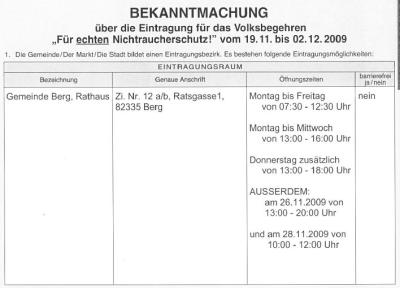 Ab morgen liegen die Listen für das Volksbegehren Nichtraucherschutz im Rathaus aus, das zusätzliche Öffnungszeiten für Berufstätige eingerichtet hat