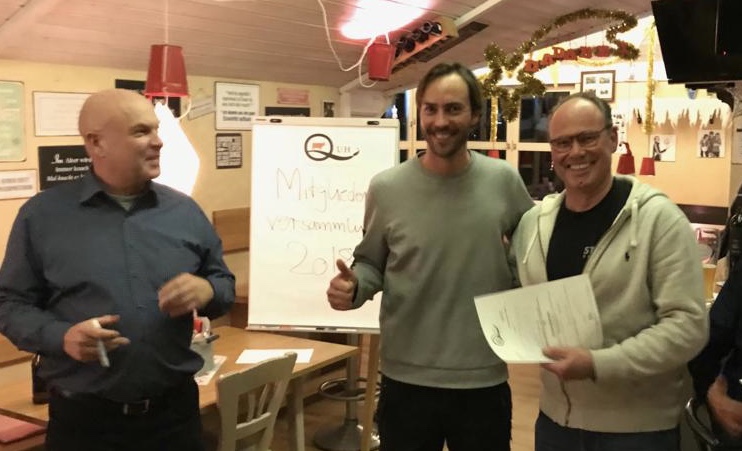 Gregory Endres (mitte) von der Berger Firma “Fokus Zukunft” mit GR Harald Kalinke und Schriftführer André “Hirte” Weibrecht bei der letzten QUH-Versammlung
