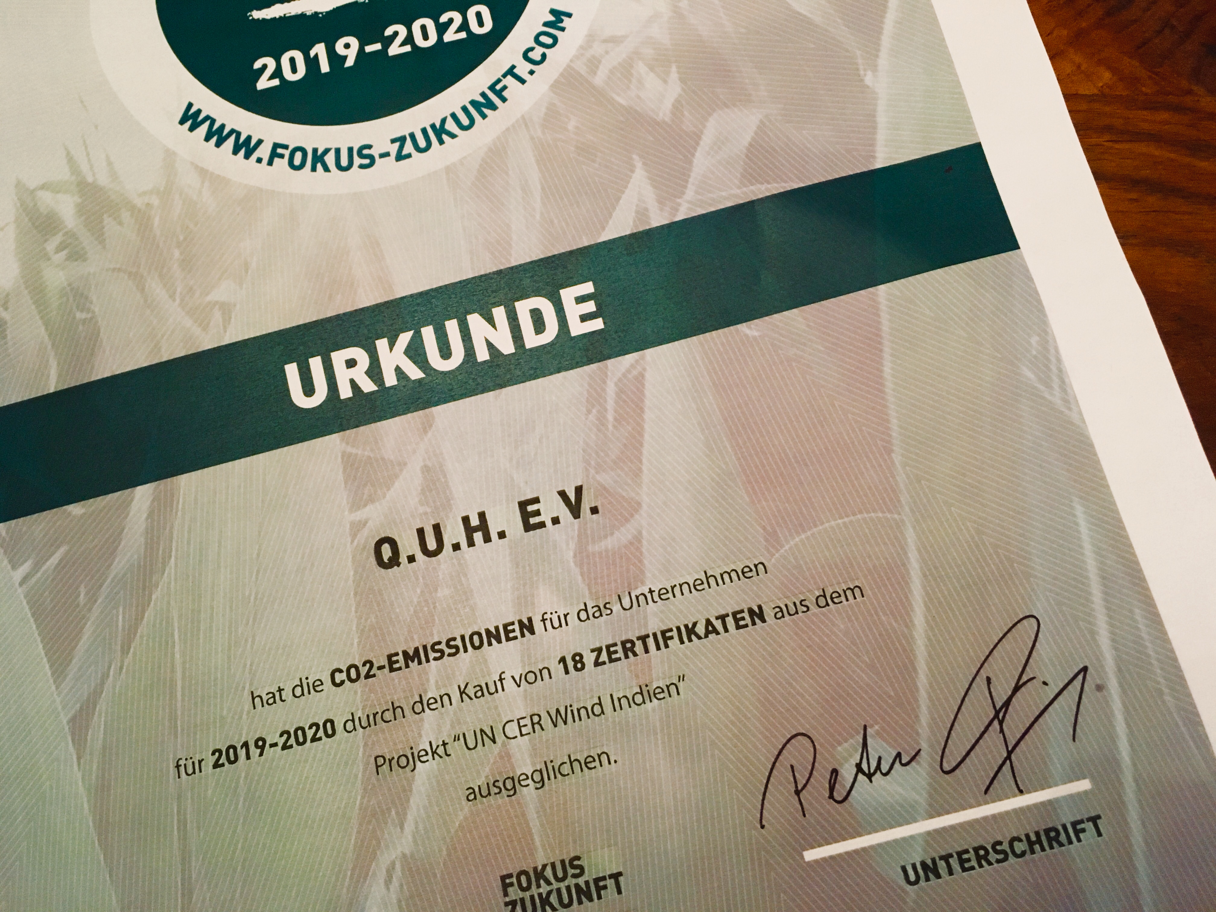 Zunächst gilt es, den exakten Wert des Fußabdrucks festzustellen. Spezialisierte Dienstleister wie wir unterstützen bei der Zahlenarbeit. Sinnvollerweise kompensiert man allerdings im nächsten Schritt nicht einfach den gesamten Aufwand, sondern reduziert zuerst seine Emissionen. Etwa durch den Ersatz alter Anlagen oder die Umstellung auf regenerativen Strom. Für die restlichen Emissionen kauft man Zertifikate. Im Sinne des Klimawandels wäre es allerdings wünschenswert, wenn Unternehmen gleich kompensieren und ihre schlechten Werte nicht erst über Jahre senken. So haben wir auch die entstandenen Emissionen durch z.B. den Treibstoff- und Papierverbrauch der QUH berechnet und mit Zertifikaten eines UN Windkraftprojektes in Indien ausgeglichen.