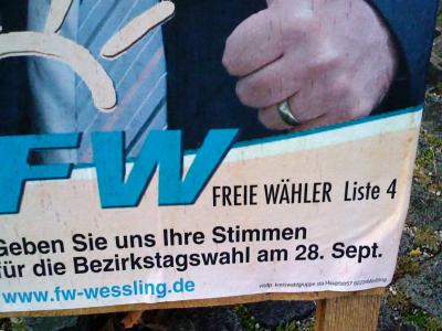 Die “Freien Wähler” sind durch ihre guten Chancen bei der kommenden Wahl offenbar so verblüfft, dass sie sich nicht trauen, farblich Stellung zu beziehen. Hier will man hauptsächlich niemanden vergraulen. Der FW-Schriftzug erscheint in einem zaghaftes CSU-blau, das von einer völlig farblosen “Grünen”-Sonne umgeben ist und pseudo-kühn mit einem zarten Hellrotrosaton hinterlegt ist. In Folge der unentschiedenen Farbwahl, die die Unentschiedenheit bei der Koalitionsaussage widerspiegelt, sehen die Plakate der FW Plakate jetzt schon so aus, als ob sie bereits drei Wahlkämpfe hinter sich haben. Vielleicht soll dies bei einer Gruppierung, die erstmals in den Landtag einziehen könnte, “Erfahrenheit” suggerieren.