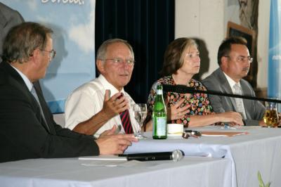 Es mag wohl an dem schönen Sommertag oder an der Uhrzeit gelegen haben, dass die CSU-Veranstaltung mit Bundesinnenminister Dr. Wolfgang Schäuble den Saal des Gasthofs zur Post nur etwas mehr als zur Hälfte füllte – die Berger Politik war nur durch drei Gemeinderäte repräsentiert. Auch die Jugend war leider kaum vertreten, um auf Tuchfühlung mit der großen Politik zu gehen und einmal einen Bundesminister live in einer Frage-Antwort-Situation zu erleben.