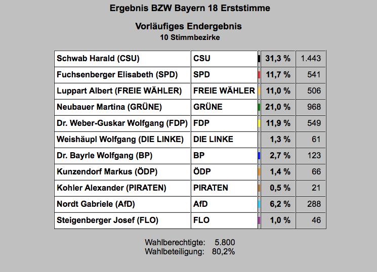 Im gesamten Starnberger Wahlkreis konnte sich Dr. Ute Eiling-Hütig (CSU) als Direktkandidation nur ungeahnt knapp mit gut 30% gegen ihre sensationell grüne Herausforderin Anne Franke (26,6%) durchsetzen. Damit zu den Zweitstimmen.