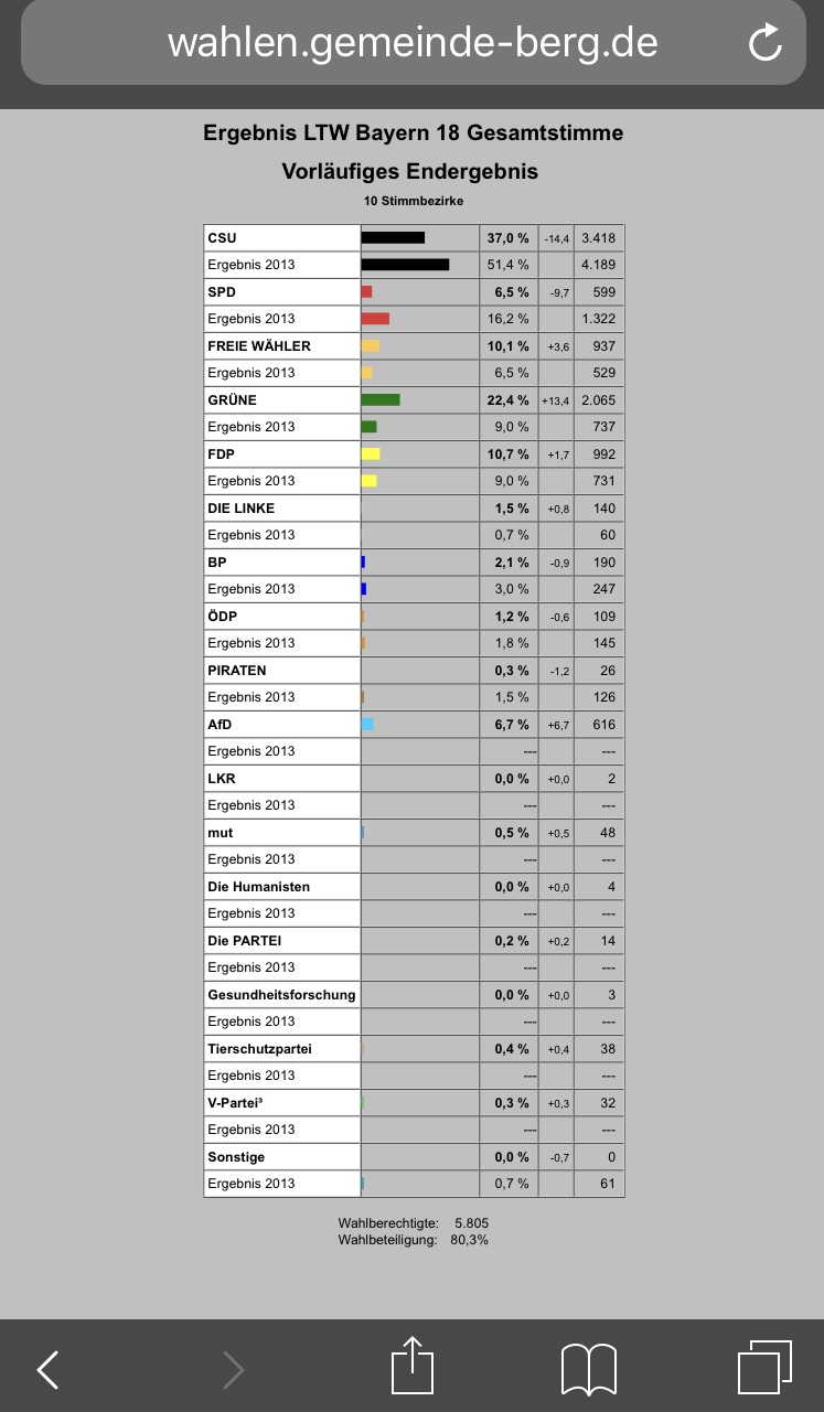 Dies sind die Berger Ergebnisse im Vergleich zur letzten Landtagswahl 2013. Die CSU verliert in Berg über 14%. Die SPD kann davon nicht profitieren, halbiert ihr eh schon schlechtes Ergebnis vom letzten Mal und bekommt nur noch erschreckende 6,5%. Die Grünen holen mehr als doppelt so viele Stimmen wie letztes Mal, fast vier Mal soviel wie die SPD, und werden mit 22,4% mit weitem Abstand zweitstärkste Partei in Berg. Freie Wähler und FDP holen in Berg gut 10%. Die Partei mit dem “für” liegt in Berg abgeschlagen bei 6,7%. Positiv: Erstens, das ist nur gut ein Drittel so viel wie bei der Bundestagswahl (9%). Dieser unheilvolle Trend ist also gestoppt. Noch positiver: Die Wahlbeteiligung insgesamt lag in Berg bei über 80 %.
