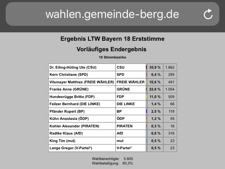 Update: Vorläufiges Endergebnis der Erststimmen für die Bezirkstagswahl auf der Homepage der Gemeinde Berg