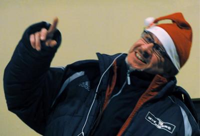 Schauspieler, AH-Spieler und Jugendtrainer Marcus Calvin (mit 10 verschiedenen MTV-Trainingsanzügen übereinander) als Weihnachtsmann beim MTV Berg