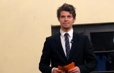 Von der Abwehr in die Moderation: Felix Link, frischgebackener Jurastudent, hatte seine Texte kurz vorher auf orangefarbenes Geschenkpapier notiert und war sichtlich um Seriosität bemüht