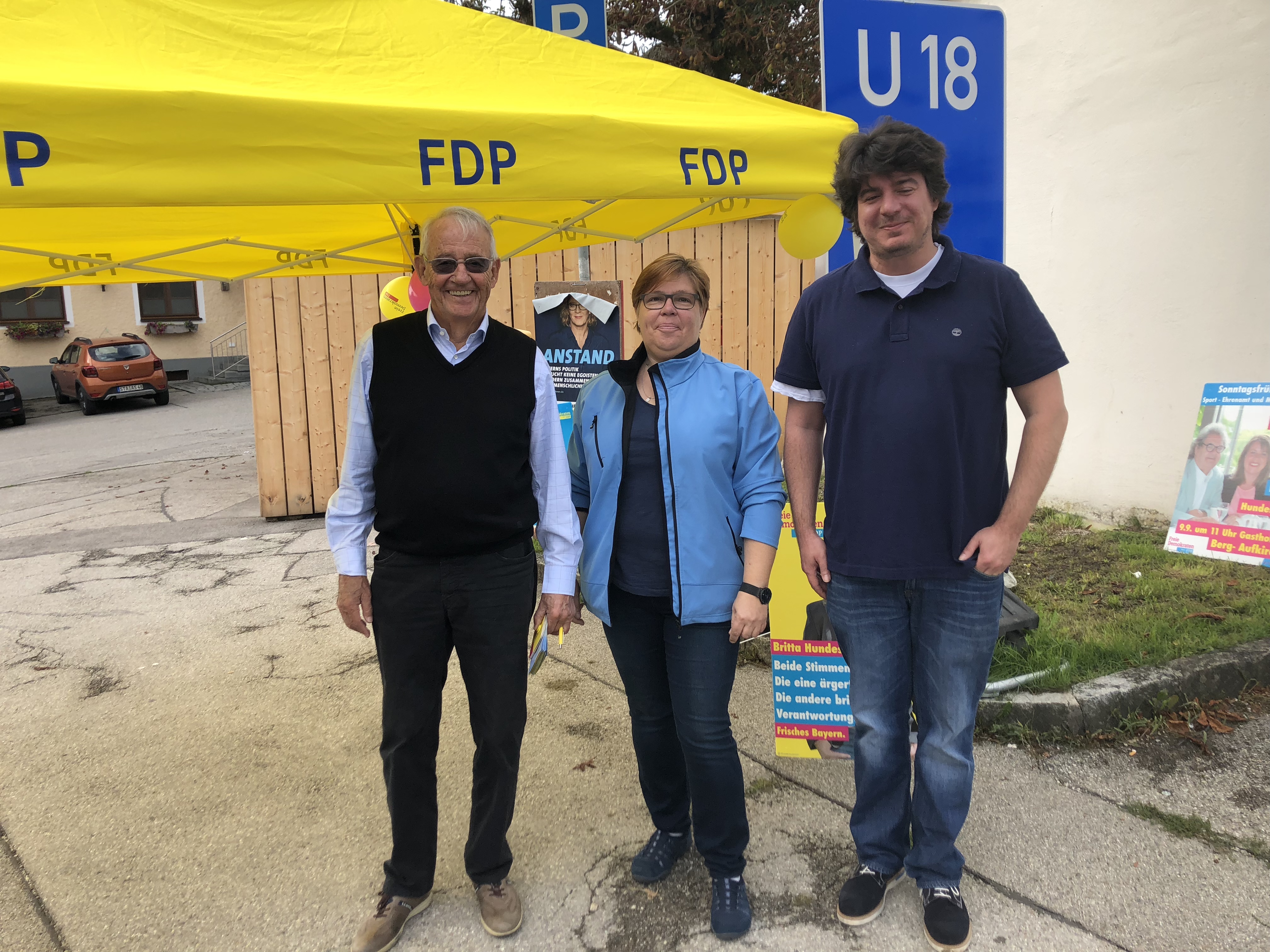 Der FDP Ortsverband Berg prägt die Politik der Landkreis-FDP. Vlnr.: Schatzmeister Rudolf Bertsch, Gemeinderätin Anke Sokolowski & der stellvertretende Vorsitzende Cedric Muth beim Landtagswahlkampf im letzten Jahr