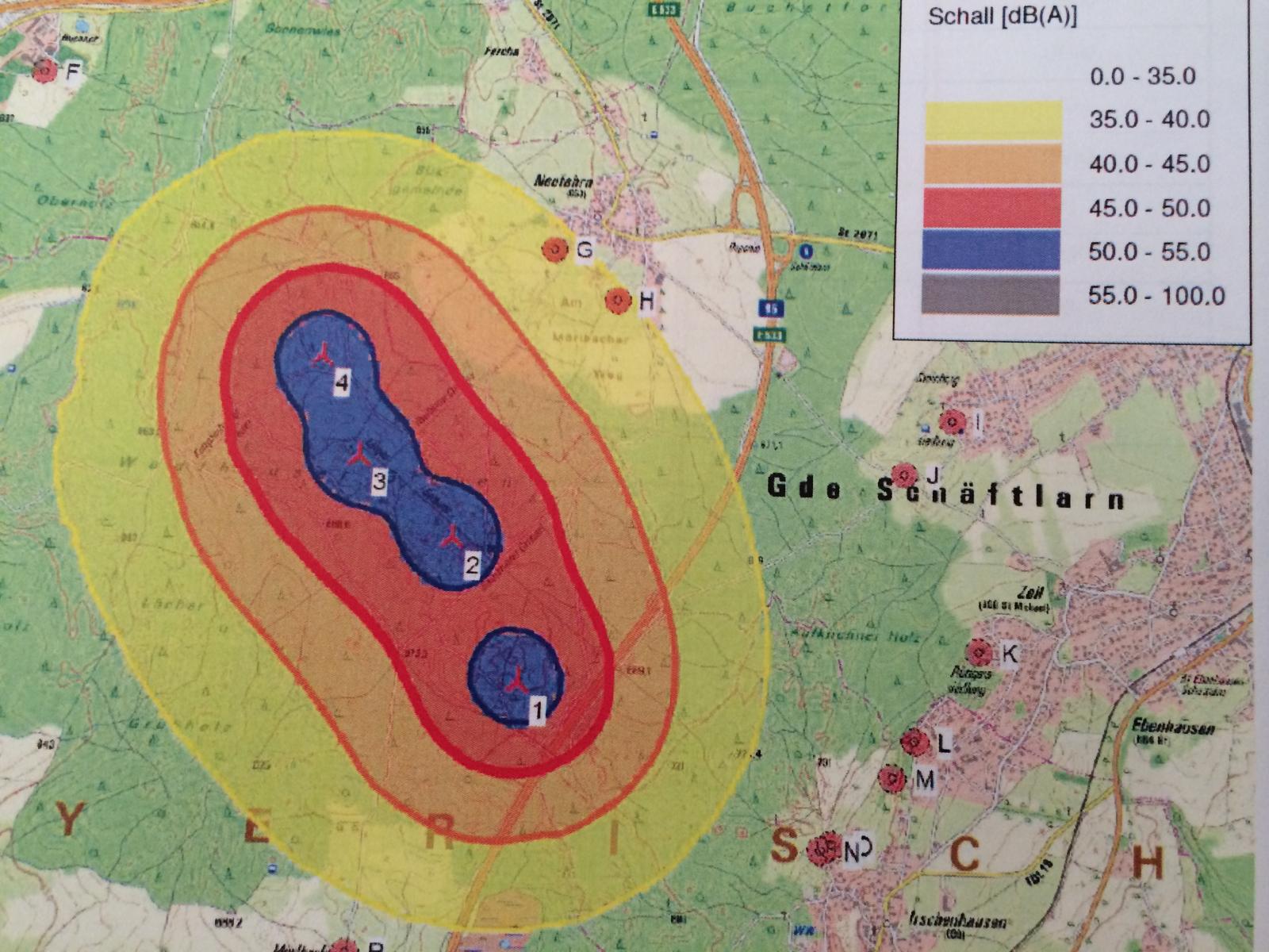 Das Gutachten ergab eine maximale Belastung von 50 – 55 dB(A) direkt bei den Anlagen – das bewegt sich zwischen “Unterhaltungssprache” und “Bürolärm”. Die äußersten Bereiche – bis auf zwei Häuser noch außerhalb des Ortsgebiets von Neufahrn – liegen mit 35-40 db(A) zwischen dem “Ticken einer leisen Uhr” und “nahem Flüstern”.