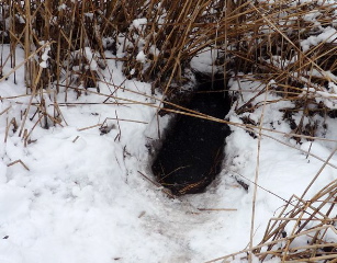 Hinten im Schilf gibt es im Eis eine Einstiegsstelle, die sich unser Nager offensichtlich zur schnellen Flucht frei gehalten hat. Gut Holz Fifi!