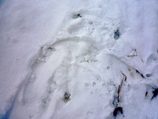 Im Schnee kann man frische Spuren erkennen. In der oberen Hälfte ein paar Fußtapser, darunter offensichtlich die Spur des hinterhergeschleppten Schwanzes. Da eigentlich nur Luchse, Wölfe oder Bären zu seinen natürlichen Feinden gehören, scheint sich Fifi bei uns recht wohl zu fühlen. Gefahr geht für ihn allerdings von freilaufenden Hunden aus, denen er an Land mit seinem watschelnden Gang nur schwer entkommen kann.