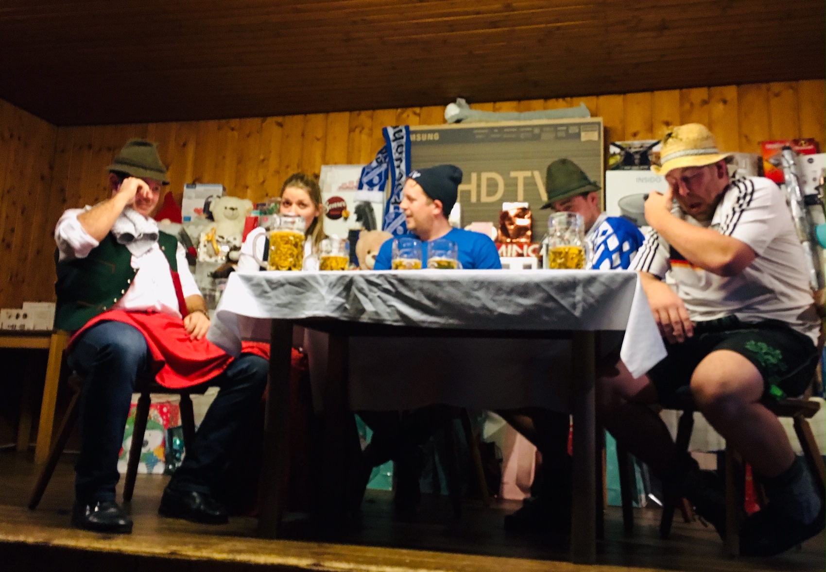 Legendär ist der alljährliche Höhenrainer “Sportlerstammtisch”, bei dem traditionellerweise auf der Bühne der Konsum von Unmengen von Bier, Rauchwaren und anderen Genusswaren vorgeführt wird. Johannes Obermeier (oben links im Bild) und Jacob Baumgartner hatten das Stück geschrieben. Sie brachten es mit Sonja Sokolowski, Johannes Rieger, Fritz Hauptenbucher und Michael Huber urkomisch auf die Bühne. Vor allem die Tränen, die sich die Protagonisten selbst in die Augen trieben, weil sie allzu große Portionen von “Schmoizler” geschnupft hatten, sorgten für lang anhaltenes Gelächter.