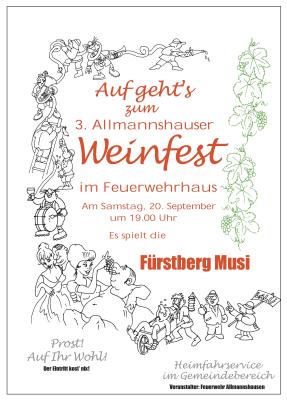 Am Samstag findet ab 19 Uhr bei der FFW Allmannshausen – noch in den alten Räumen – zum dritten Mal das Weinfest statt. Und natürlich kommen wir gerne der Bitte der Feuerwehr nach und veröffentlichen hiermit eine Einladung an die gesamte Gemeinde, sich am Samstag bei gutem Wein nett zu trinken und zu plaudern und sich zu den Klängen der Fürtberg Musi nebenbei über die Renovierungsbedürftigkeit des Feuerwehrhauses vor Ort zu informieren.