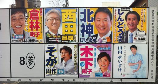 Auch der Vergleich der Wahlplakate in Japan und Deutschland hinkt gewaltig. Da sollten Sie mal einen Wahlkampf in Japan miterleben, wenn Lastwagen und Flugzeuge mit Lautsprechern die Bevölkerung beschallen. Und bezüglich des Wahrheitsgehaltes von Wahlversprechen in Japan möchte ich Ihnen nicht alle Illusionen nehmen. Und bezgl. Wahlbeteiligung ist Japan bestimmt kein Vorbild.