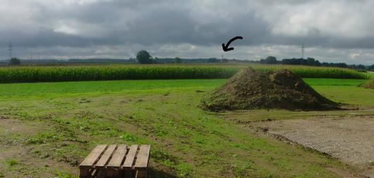 In gut 1200 m Entfernung das Dorf, dessen Anwohner die Anlage finanziert haben (ganz klein – links oberhalb des Erdhaufens – erkennt man mit Mühe am Horizont den Kirchturm).