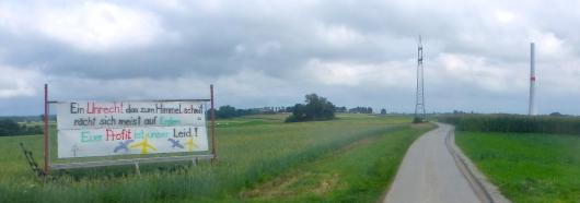 Die Türme … von Bidingen kann man übrigens prima selbst aus Richtung Starnberg sehen, wenn man nach Andechs fährt und kurz vor Erling ist. Man sieht dann die sich drehenden Rotoren, man genießt die selbst aus 30 km Luftlinie zerstörte Landschaft und freut sich über grüne Träume.