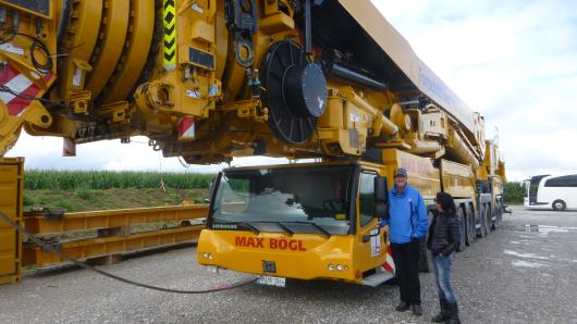 “Wär das nichts für den Bauhof?” – Die stellvertretenden Bürgermeister Elke Link (QUH) und Andi Hlavaty (CSU) vor Deutschlands größtem Kran (210 t), mit dem das Bauwerk, das im Oktober ans Netz gehen soll, errichtet wird.