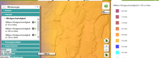 Der Windatlas orakelt für Bidingen Windgeschwindigkeiten in 160m Höhe um 5,4; erzielt werden durchschnittlich 6,0; für den Höhenzug der Wadlhauser Gräben werden 5,3 angegeben; Messungen ergaben 5,9 bzw. 6.0.