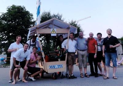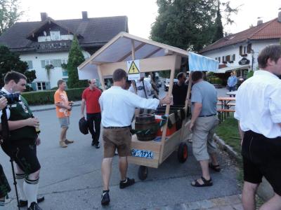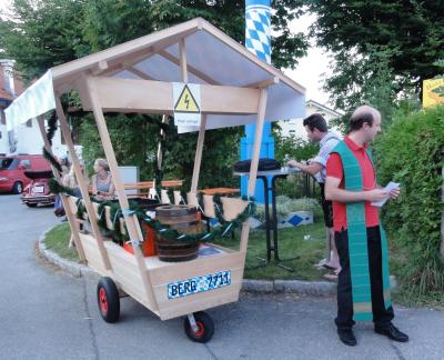 Wie kam’s? Nach der Organisation des König-Ludwig-Fests war ein ganz neuer Zusammenhalt innerhalb der Berger Dorfgemeinschaft entstanden. Am 7.7.11 kam man – auf dem Weg zur Farchner Sonnwendfeier mit einem Kasten Bier hungernd auf der Lüßbachbrücke gestrandet – auf die Idee, einen Wagen für (fast) alle Grundbedürfnisse zu bauen. Mitstreiter wurden gesucht und gefunden, und nun gab es sogar eine Fahrzeugweihe.