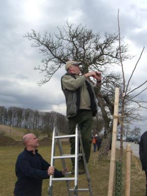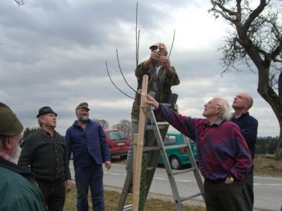 An der neu gepflanzten Obstbaumallee am Laurentiweg in Biberkor konnte nun jeder Teilnehmer unter Anleitung der Profis vom OGBV den zuvor gezeigten Pflanzschnitt an einem Apfel- oder Zwetschgenbaum vornehmen.